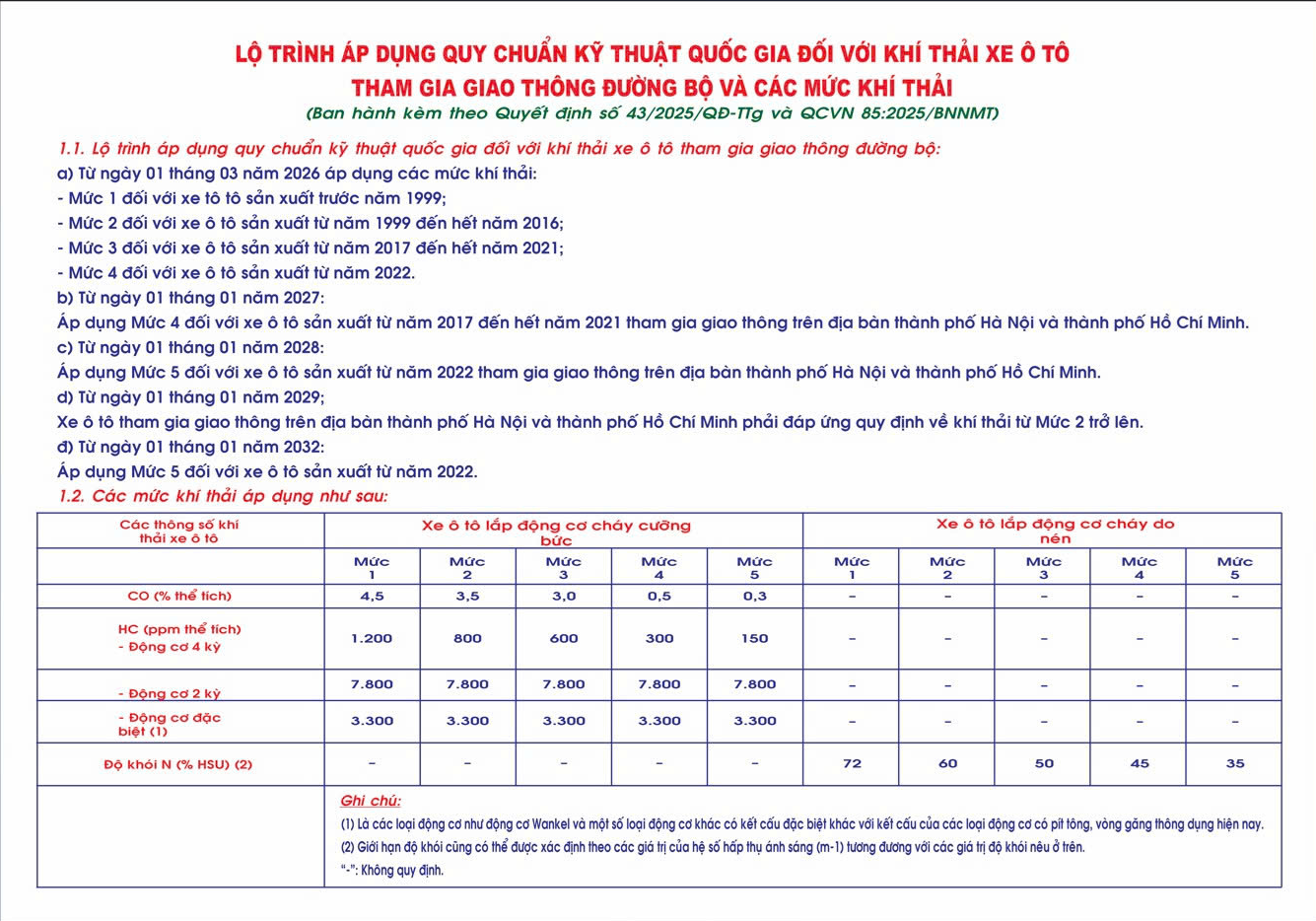 Quy định mới không chỉ thay đổi các chỉ số kỹ thuật khi kiểm định mà còn phân cấp lộ trình thắt chặt theo từng khu vực và năm sản xuất của phương tiện. Cụ thể, ô tô sản xuất trước năm 1999 phải đạt tiêu chuẩn khí thải mức 1 (tương đương tiêu chuẩn Euro 1). Ô tô sản xuất từ năm 1999 đến hết năm 2016 áp dụng mức 2 (tương đương Euro 2). Ô tô sản xuất từ năm 2017 đến hết năm 2021 áp dụng mức 3 (tương đương Euro 3). Ô tô sản xuất từ năm 2022 áp dụng mức 4 (tương đương Euro 4).