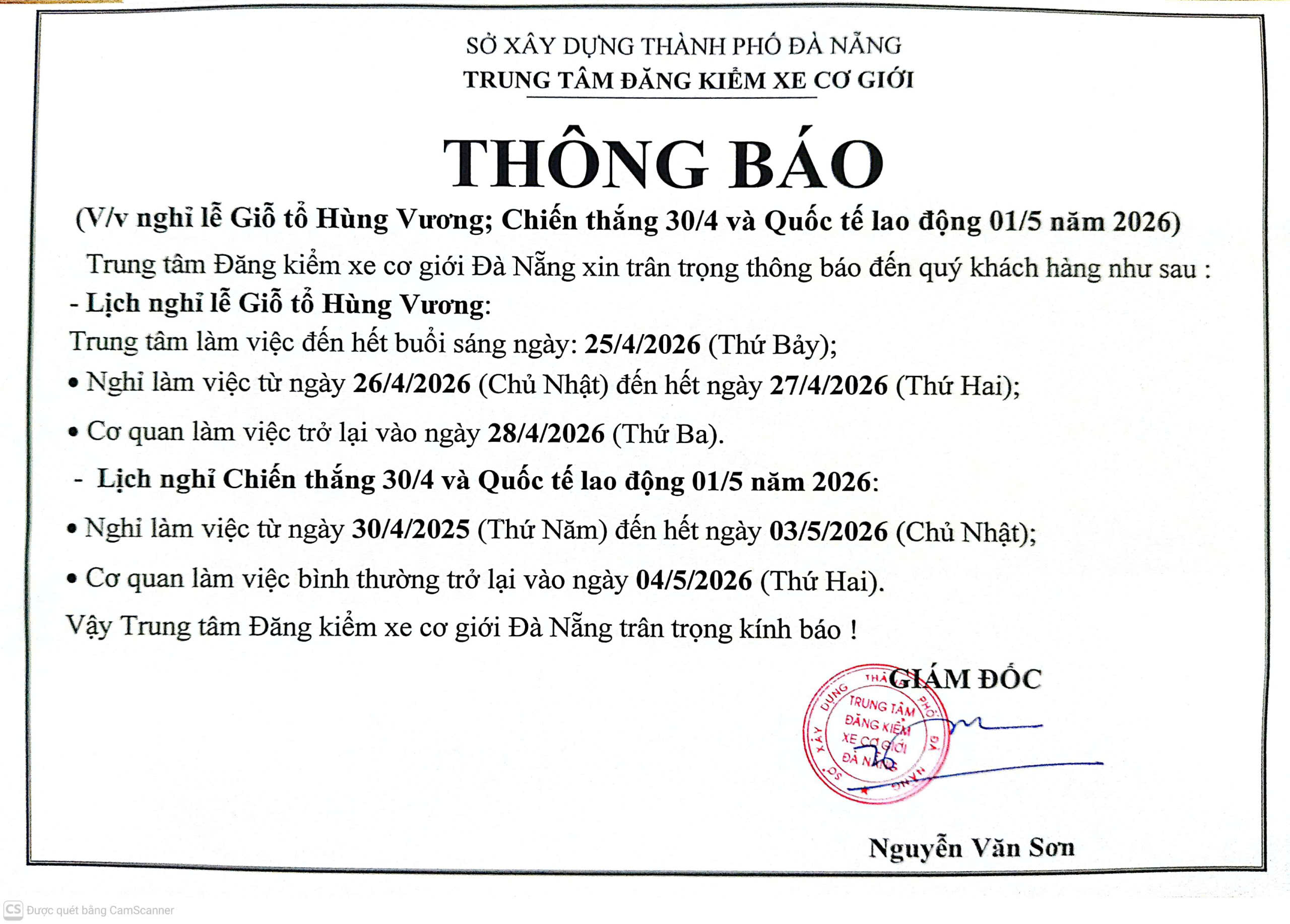 Trung tâm Đăng kiểm xe cơ giới 43-01S& 43-02S thông báo lịch nghỉ Tết Dương lịch 2026